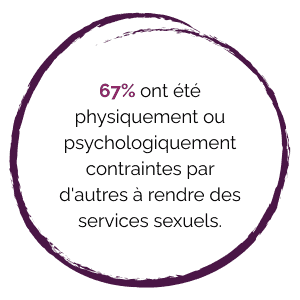 Ces données portent sur la période de 2015-2016 à 2019-2020 et représentent 2 289 personnes sondées dans le cadre du rapport produit par la Direction de la recherche et de la statistique du ministère de la Justice Canada : l’Évaluation de l’Initiative sur les mesures pour contrer la prostitution (IMCP).